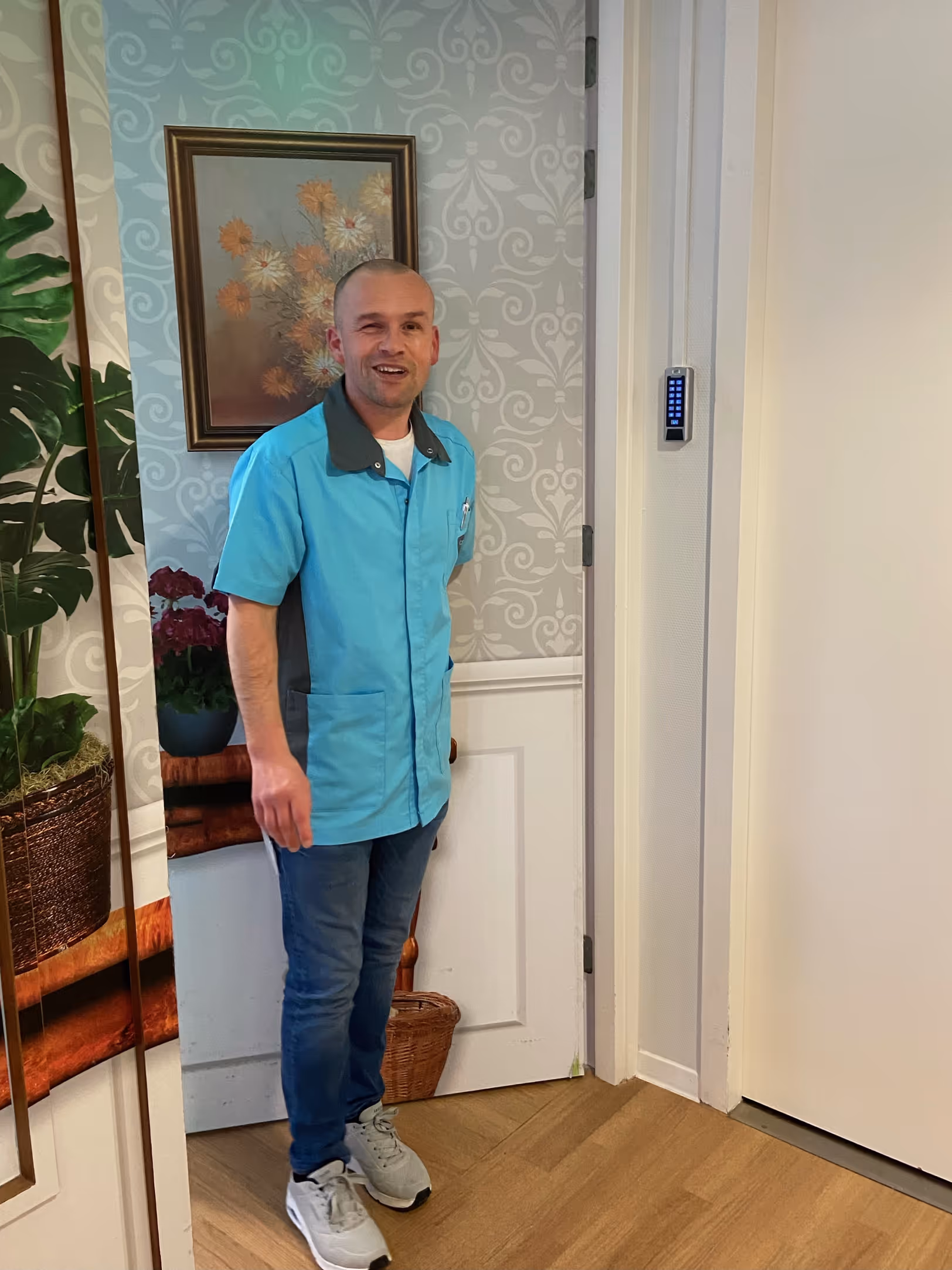 Johan kwam in contact met re-integratiespecialist Karin Grobbink van at.groep en vertelde haar over zijn twijfels en zoektocht. “Die begeleiding was echt heel fijn. Karin heeft gewoon verstand van zaken. De gesprekken met haar gaven mij rust. Ik kreeg al snel het gevoel dat het wel goed zou komen. Toen ik verteld had over mijn wens om in de zorg te werken, legde zij de contacten. Op 5 mei 2021 ging ik voor het eerst naar Carintreggeland om een dag mee te lopen. Zo bijzonder was dat. Ik werk daar met mensen die dementerend zijn. Eerst hielp ik met wat huishoudelijke klusjes in de gezamenlijke woonkamer. Later mocht ik ook helpen met ADL, ofwel; algemeen dagelijkse levensverrichtingen zoals in- en uit bed gaan, aankleden, eten en drinken. Mijn dag is geslaagd als ik merk dat de bewoners het naar de zin hebben. Als ik een paar keer een lach op hun gezicht kan toveren en een knuffel van ze krijg.”