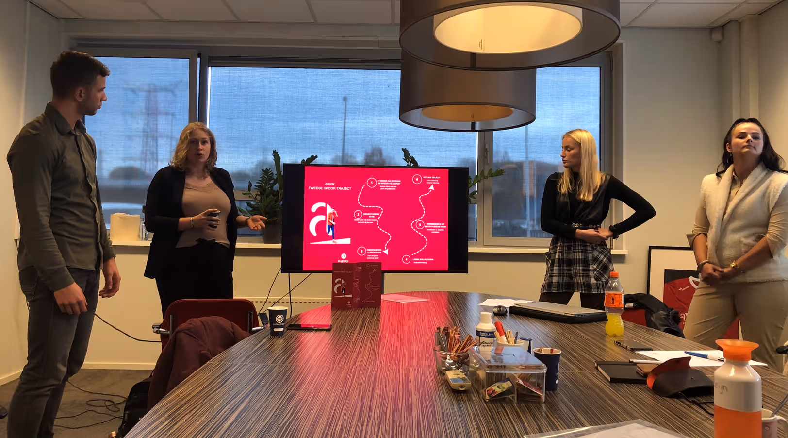 Afgelopen dinsdag was het zover. De vier derdejaars studenten HRM/HRD gaven hun eindpresentatie van de Lab-opdracht die zij uitvoerden voor at.groep. Hoofddoel van zo’n Lab-opdracht is het ontwerpen van een maatwerk loopbaaninterventie. Ingeborg IJssels, HRM-adviseur bij at.groep begeleidde hen de afgelopen tien weken. Ze is trots op het eindresultaat. “We kunnen de folder die zij maakten, direct gebruiken voor mensen die bij ons een 2e spoor re-integratietraject (gaan) volgen. In de folder wordt stap voor stap uitgelegd wat at.groep doet voor de medewerker die gaat re-integreren. Hoe de coach met de kandidaat kijkt naar wat écht bij hem past. En waaruit de begeleiding bestaat om daar te komen. Beter en duidelijker hadden we het zelf niet kunnen zeggen.”
