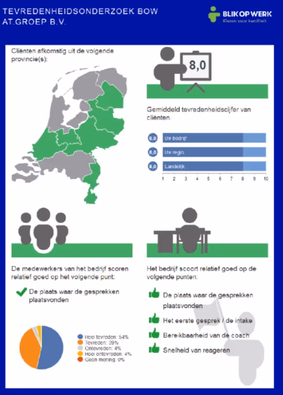 at.groep heeft opnieuw mooie resultaten behaald voor het Blik op Werk-keurmerk! 🎉 Onze opdrachtgevers waarderen ons met een 7,9 en onze klanten geven ons gemiddeld een 8,0 voor onze dienstverlening.